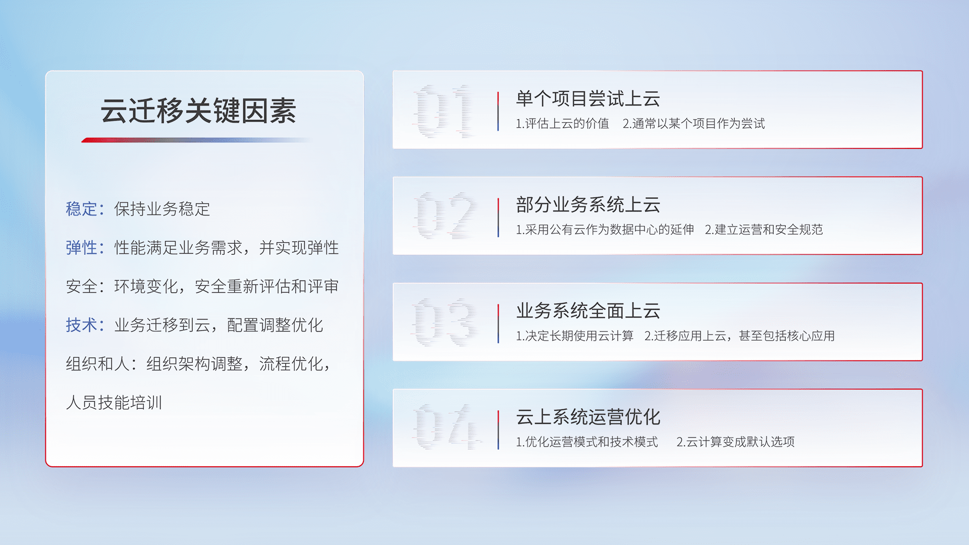 结合实际业务,,,,从规划设计、、云平台选型、、、云原生改造、、、数据迁移、、集成交付,,,迁移全过程为客户识别最佳上云路径,,做好风险识别管理,,,设计网络架构、、、身份权限、、、、安全审计合规、、操作审计、、、、日志审计、、、、监控告警策略、、多站点容灾设计等,,对云上基础设施进行整体规划,,,提升IT治理水平,,,,以满足弹性、、、高可用、、、高性能的需求。。。