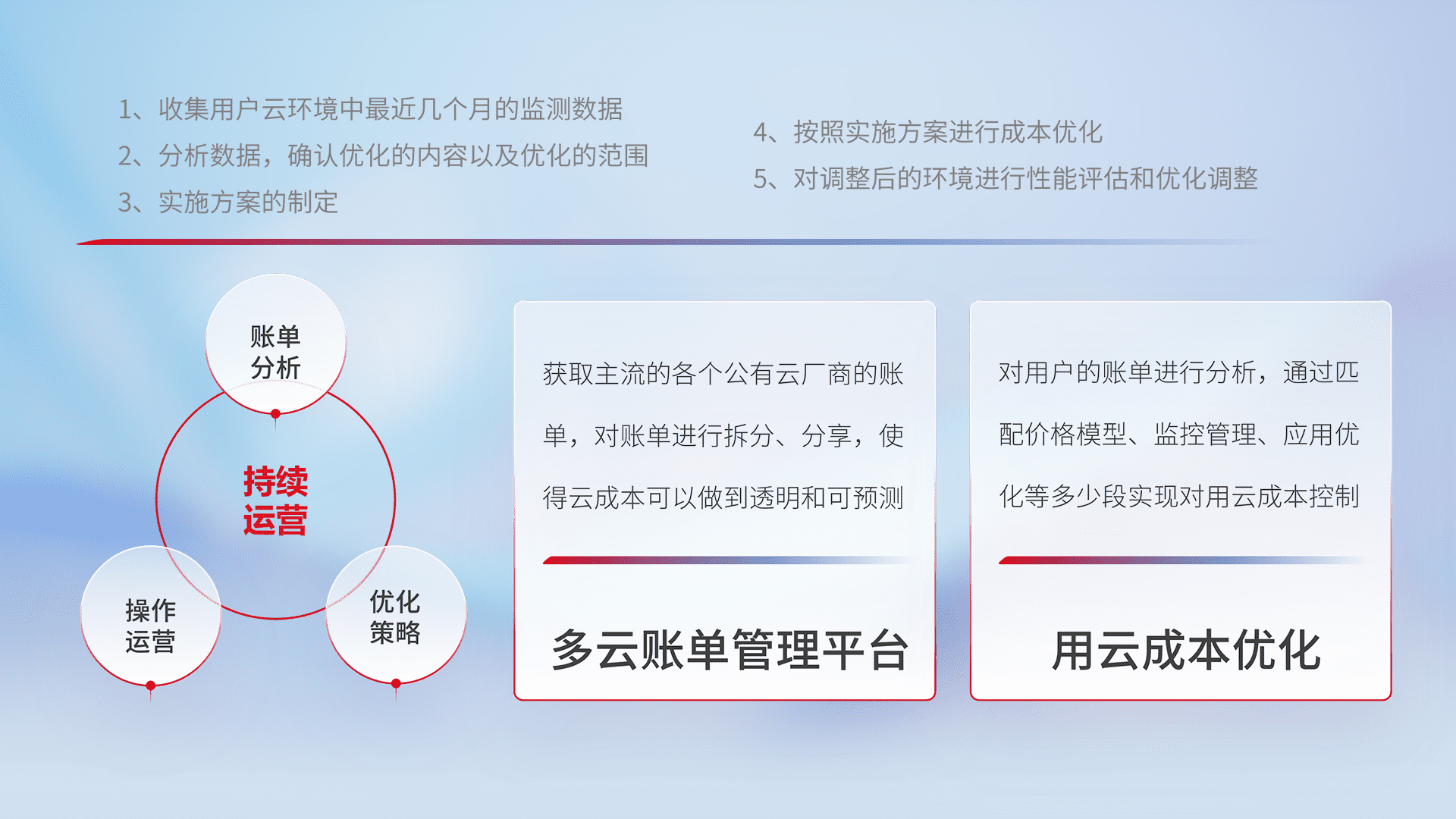 通过多云纳管,,,以统一的资源数据模型把客户的云资源进行抽象和封装,,进而实现对多云资源的统一操作,,,保障云资源管理的可靠性、、、稳定性与可用性。。。。量身定制化运维内容,,配置、、、开发运维、、、补丁管理、、、、备份、、、监控、、、认证和访问管理、、审计和日常巡检等,,,保障在用云过程中的可靠度,,,,稳定度以及高可用率。。。